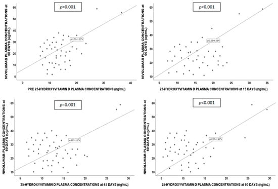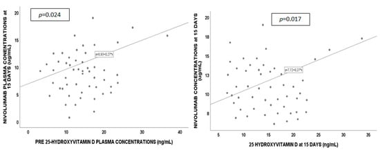 Correlations (see Figure 2) were observed between nivolumab concentrations at 15 days and BL 25-VD levels (p = 0.024, Pearson’s coefficient (PC) 0.451) and at 15 days (p = 0.017, PC = 0.542). Nivolumab exposure at 60 days was correlated with 25-VD at BL (p = 0.001, PC = 0.730), at 15 (p < 0.001, PC = 0.858), 45 (p = 0.001, PC = 0.779), and 60 days (p < 0.001, PC = 0.900). Furthermore, in a sub-group, patients were stratified according to 25-VD deficiency. BL 25-VD levels < 10 ng/mL were associated with lower nivolumab concentrations at 15 days (p = 0.103, a trend without statistical significance), 45 days (p = 0.018), and 60 days (p = 0.021). Fifteen days of 25-VD < 10 ng/mL levels were associated with lower nivolumab concentrations at 15 days (p = 0.019), 45 days (p = 0.019), and 60 days (p = 0.028). Finally, 60 days of 25-VD < 10 ng/mL was associated with lower nivolumab levels at 60 days (p = 0.030). No correlation was observed for 1,25-VD or toxicities and nivolumab exposure.