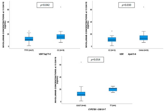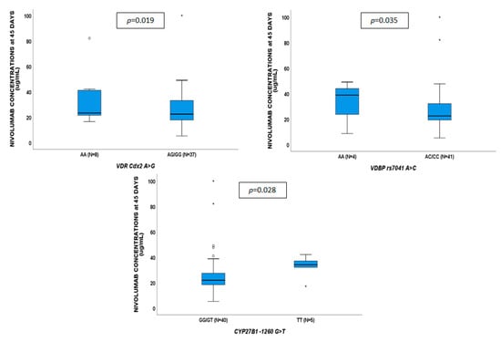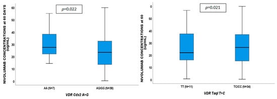 Our study would recommend to clinicians to evaluate 25-VD levels and the VDBP rs7041 genotype, before starting therapy, and to quantify nivolumab concentrations at 15 days, to eventually consider a drug dosage modification or VD supplementation, reducing the risk of tumor progression. It is important to highlight that these analyses are preliminary and have several limitations: They are conducted on few individuals (only 45 patients), only one cohort is analyzed, and VDBP SNP has a borderline influence (p = 0.049).