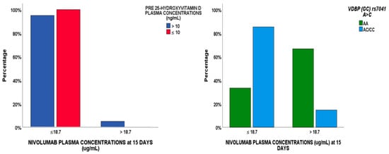 A logistical regression analysis was performed to evaluate whether factors (demographic, clinical, pharmacological or genetic) were able to predict nivolumab concentrations <18.7 μg/mL at 15 days (see Table 3). According to a Bonferroni test, p < 0.003 was considered to be the adjusted p-value, but no factors reached this value in the univariate analysis. In the multivariate model, VDBP (GC) AC/CC genotype and BL 25-VD were predictors of this cut-off value, associated with tumor progression (Figure 6).