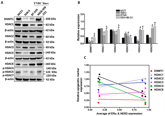 2.1. Differential Expression of ERα, HER2/ERBB2, DNMT1 and HDACs in Breast Cancer Cells