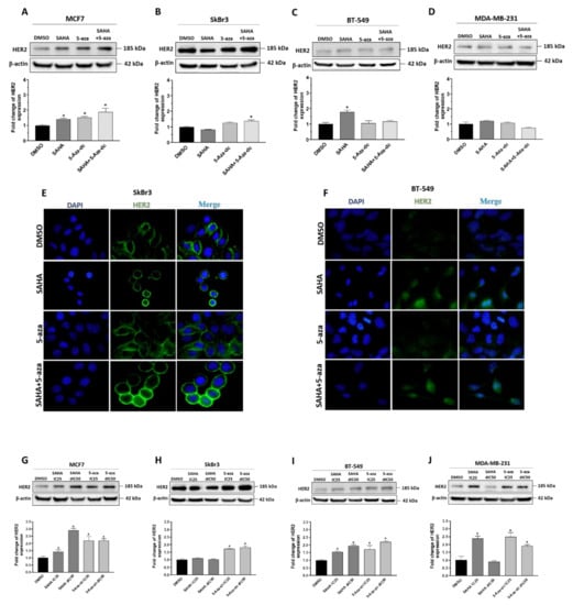 2.4. Effect of SAHA and/or 5-aza-dc on the Expression Level of HER2/ERBB2