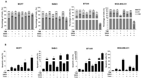 2.6. Effect of SAHA and/or 5-aza-dc on Cell Cycle Distribution and Apoptosis in Breast Cancer Cells