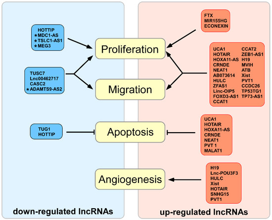 Up-regulated and down-regulated long non-coding RNAs in glioma and their influence on the biological processes. Red indicates up-regulated RNAs in glioma, and blue indicates down-regulated RNAs in glioma. Arrows indicate increased activity of the process; hammerhead arrows indicate decreased activity of the process; asterisk indicates poorly characterized lncRNAs.