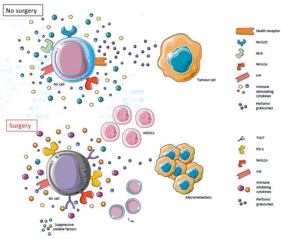 Natural Killer (NK) cells effector functions are impaired postoperatively. In the absence of surgery, NK cells are able to appropriately exert their effector functions thereby directly and indirectly acting to suppress tumor growth and proliferation. In the postoperative period, however, NK cell function is suppressed, leading to a metastatic formation in cancer surgery patients. In our proposed model, surgically stressed NK cells undergo changes in receptor expression mediated by stress-induced soluble factors and surgery-induced suppressive cell populations.