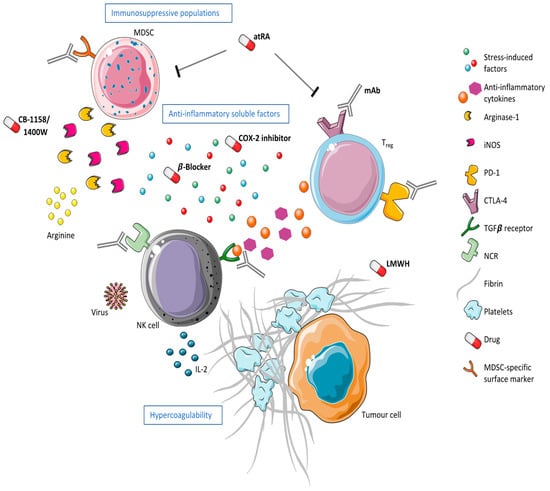 A suppressive environment alters NK cell biology in the postoperative period. A hypercoagulable state physically sequesters tumor cells from NK cells while soluble factors, such as anti-inflammatory cytokines and stress-related factors, as well as immunosuppressive MDSC and Treg populations suppress NK cell activity postoperatively. This figure outlines potential therapeutics targeting extracellular and intracellular changes as a result of surgical stress. Low-molecular-weight heparin (LMWH) can inhibit P-selectin-mediated adhesion of activated platelets to tumor cells, thereby reducing tumor cell emboli. Pharmacological therapeutics such as CB-1158 or 1400 W could be used to inhibit arginase-1 or iNOS, MDSC-derived enzymes responsible for increased nitric oxide (NO) and reduced arginine postoperatively. COX-2 inhibitors could be used in conjunction with β-Blockers to inhibit the formation and release of stress-induced prostaglandins. All-trans retinoid acid (atRA) could be used to induce MDSC differentiation and/or deplete Tregs. Monoclonal antibodies (mAb) could be employed to inhibit or activate receptors on the surface of immune cells, including NK cells, MDSCs, and Tregs, in order to modulate their activity. Viral vaccines or oncolytic viruses could be used to promote NK cell activity against micrometastases. Finally, the administration of perioperative cytokines, such as IL-2, could boost NK cell function in the postoperative period.