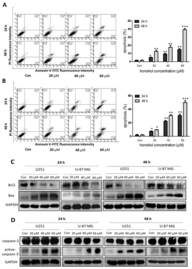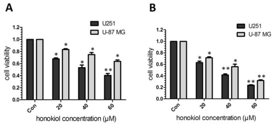 At concentrations of honokiol ranging from 0 to 60 µM, cell viability was dose-dependently reduced for U251 and U-87 MG cells compared with the vehicle control after treatment for 24 and 49 h (Figure 1A,B).