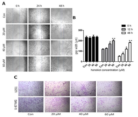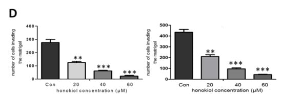 2.2. Honokiol Inhibits Cell Migration/Proliferation and Invasion