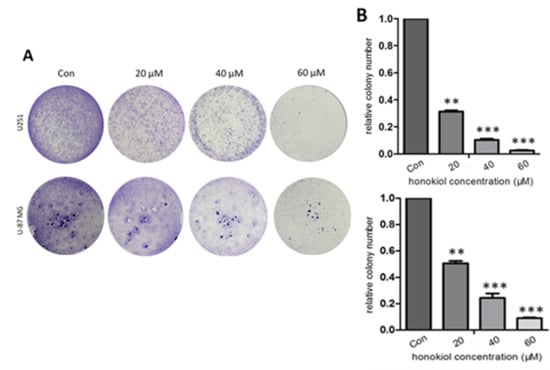 Quantification of colony formation. Representative images from 3 independent experiments are shown in (A). As indicated by the relative level of colony formation, honokiol inhibits colony formation of U251 and U-87 MG cells (B). Data are presented as means ± SEM from 3 independent experiments. ** p < 0.01 and *** p < 0.001 vs. vehicle control group (one-way ANOVA with Tukey’s post-hoc test).