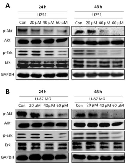 Phosphorylation of Erk and Ark was measured by western blot analysis after incubation with honokiol (20, 40 and 60 μM) for 24 and 48 h, showing that p-Akt levels were profoundly reduced after treatment with honokiol at 40 and 60 μM in both cell lines at both 24 h and 48 h incubation times (Figure 5A,B). Similarly, U251 cells treated with 60 μM honokiol showed a reduced p-Erk level at 24 h, with a considerable reduction in p-Erk level at 48 h incubation time at doses of 40 and 60 μM (Figure 5A). In contrast, p-Erk was strongly reduced only in U-87 MG cells treated with 60 μM honokiol at both incubation time points (Figure 5B).