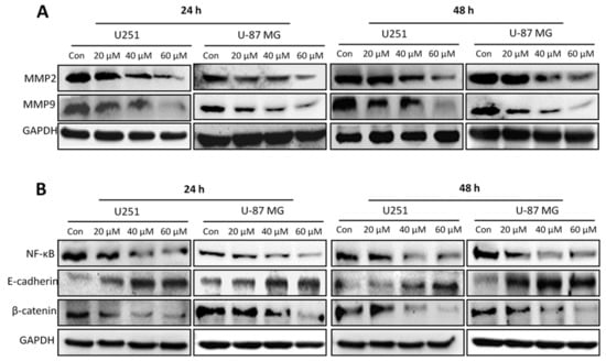 Honokiol inhibits MMP2 and MMP9 expression, as well as NFκB, E-cadherin and β-catenin expression in both cell lines. (A) MMP2 and MMP9 protein levels were determined by western blot analysis in U251 and U-87 MG cells after treatment with different concentrations of honokiol for 24 and 48 h. (B) NFκB, E-cadherin and β-catenin protein levels were determined by western blot analysis in U251 and U-87 MG cells after treatment with different concentrations of honokiol for 24 and 48 h.