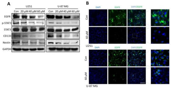 U251 and U-87 MG cells were seeded into glass coverslip in a 24-well plate at a density of 5 × 104 cells per well. After overnight incubation, the culture medium was removed and the cells were incubated with honokiol at doses ranging from 0 to 60 µM in complete culture medium and cells were further cultured for 48 h. Fixed U251 and U-87 MG cells were incubated with anti-EGFR (ErbB1) antibody (1:200; Cat. No. 66455-1-Ig, Proteintech, Rosemont, IL, USA) overnight at 4 °C. After washing in PBS three times for 5 min each, the samples were incubated at room temperature with FITC-conjugated goat anti-mouse IgG antibody (1:500; Jackson ImmunoResearch, West Grove, PA, USA) for 60 min at room temperature. The cells were then stained with 4′,6-diamidino-2-phenylindole (DAPI) and mounted using anti-fade mounting solution (Beyotime).