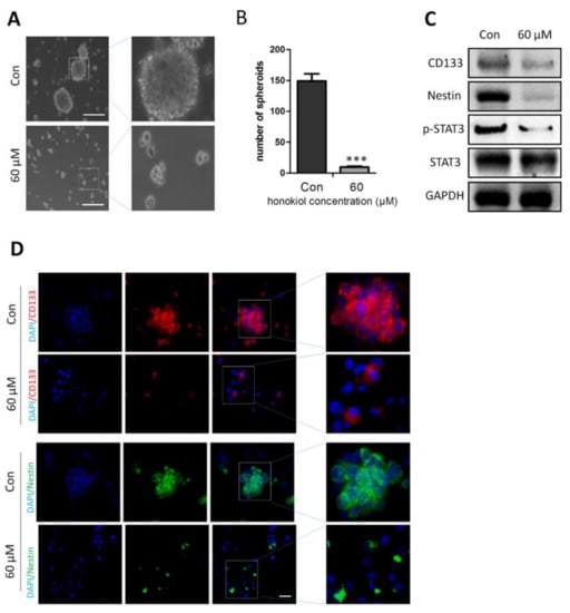 Spheroid formation is a typical characteristic of glioma stem cells. Based on the inhibition of CD133 and Nestin by honokiol, we hypothesized that honokiol may inhibit spheroid formation of stem cells. As indicated by the number of spheroids, 60 μM honokiol reduced spheroid formation of U-87 MG stem cells (Figure 8A,B). Western blot analysis also showed reduced protein levels of CD133, Nestin and phosphorylation of STAT3 in stem cell spheroids (Figure 8C). In agreement with the western blot results, immunofluorescence staining demonstrated reduced fluorescence intensity for both CD133 and Nestin in response to 60 μM of honokiol in U-87 MG stem cell spheroids (Figure 8D).