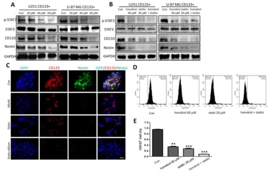 Honokiol down-regulates CD133 and Nestin expression via the JAK/STAT pathway in CD133 immunopositive cells. (A) CD133, Nestin and p-STAT3 levels were determined by western blot analysis. (B) Administration of 60 μM of honokiol, 20 μM of Stattic and mixture of both reduces p-STAT3, CD133 and Nestin levels. (C) Expression of CD133 (red) and Nestin (green) with nuclei counterstained with DAPI (blue). Scale bar: 20 μm. (D,E) Honokiol, Stattic and the mixture of both decrease numbers of U-87 MG cells immunopositive for CD133 and Nestin as evaluated by flow cytometry. Data are presented as means ± SEM from 3 independent experiments. ** p < 0.01 and *** p < 0.001 vs. vehicle control group.