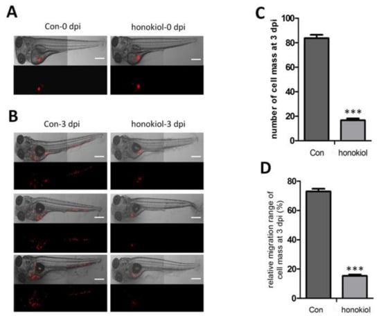 When about 200 CM-DiI labeled U-87 MG cells were injected into the zebrafish yolk sac at 2 dpf and examined by fluorescence microscopy, proliferation and migration of U-87 MG cells at 0 day and 3 days after injection (Figure 10A,B), vehicle-treated cells had migrated from the yolk sac into the whole body including tail and head region, whereas honokiol-treated cells were mainly accumulated in the yolk sac without emigration (Figure 10B). Honokiol treatment reduced the number of cell mass when compared with the vehicle-treated cells at 3 days after injection (p < 0.001) (Figure 10C). In addition, honokiol inhibited glioma cell migration, as indicated by the relative cell mass migration at 3 days after injection (p < 0.001) (Figure 10D). The combined results indicate that honokiol inhibits glioma cell proliferation and migration in vivo.