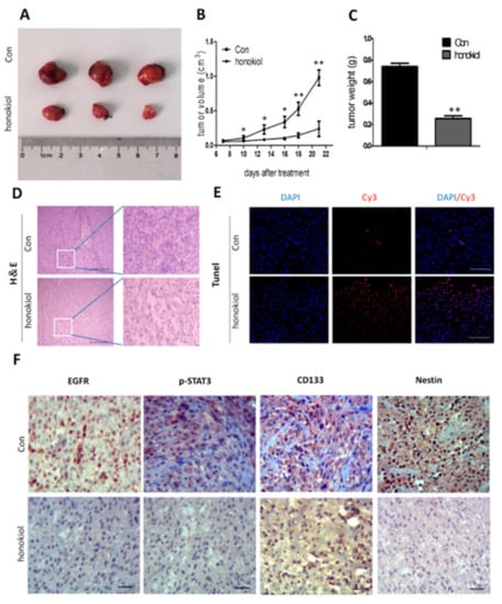 Honokiol inhibits tumor growth in xenografted nude mouse mice. (A) Representative images of U-87MG xenografts 21 days after treatment. (B) Quantification of tumor volume up to 22 days after grafting ((* p < 0.05 and ** p < 0.01 vs. vehicle control group). (C) Tumor weight at 21 days after treatment. (** p < 0.01 vs. vehicle control group). (D) Representative H&E stained images 21 days after treatment (E) Representative images for TUNEL-positive and DAPI-positive cells in the tumor tissue 21 days after treatment. TUNEL (red) and DAPI (blue). Scale bar: 200 μm. (F) Immunohistochemistry of CD133, Nestin, p-STAT3 and EGFR in U-87 MG cell xenografted tumors treated with either vehicle or honokiol. Scale bar: 20 μm.