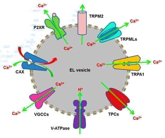 The endolysosomal Ca2+ toolkit. Refilling of the EL Ca2+ store is driven by the H+ gradient established through the v-ATPase and effected by a Ca2+/H+ exchanger (CAX) in nonplacental mammalian cells. EL Ca2+ release may occur through multiple Ca2+-permeable channels, such as such as TRPML1-3, TRPM2, TRP Ankyrin 1 (TRPA1), TPC1-2, ATP-gated ionotropic P2X4 receptors and voltage-gated Ca2+ channels (VGCCs).