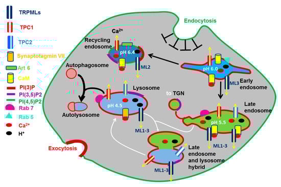 TRPML1-3 and TPC1-2 in the endocytic pathway. Endosomal vesicles undergo cargo-dependent maturation (black arrows), membrane fusion (white arrows), and fission/budding (red arrow). The molecular identity of each intracellular compartment is defined by specific recruitment of small G proteins (Rab and Arf GTPases) and the composition of phosphoinositides (PIPs). Endolysosomal compartments are featured by a weak-to-highly acidic pH, which has therefore been indicated for each organelle. Many steps of the endocytic pathway are Ca2+-dependent due to the involvement of specific Ca2+-dependent decoders, such as calmodulin (CaM) and synaptotagmin VII (Syt), and Arf6. All the abbreviations are indicated on the left, with the exception of TGN (Trans Golgi Network).