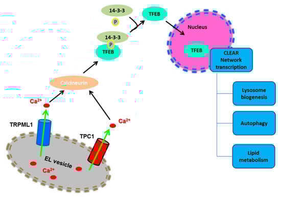 Conversely, in conditions of nutrient starvation, mTORC1 is inactivated and dissociates from the lysosomal surface [,,]. Moreover, starvation causes a spatially-restricted increase in [Ca2+]i concentration by further mobilizing lysosomal Ca2+ through TRPML1 []: these TRPML1-mediated local Ca2+ signals recruit calcineurin (CaN) to dephosphorylate TFEB, which dissociates from 14-3-3 proteins and shuttles into the nucleus to trigger the transcriptional program driving lysosomal biogenesis and autophagy [,,] (Figure 3).