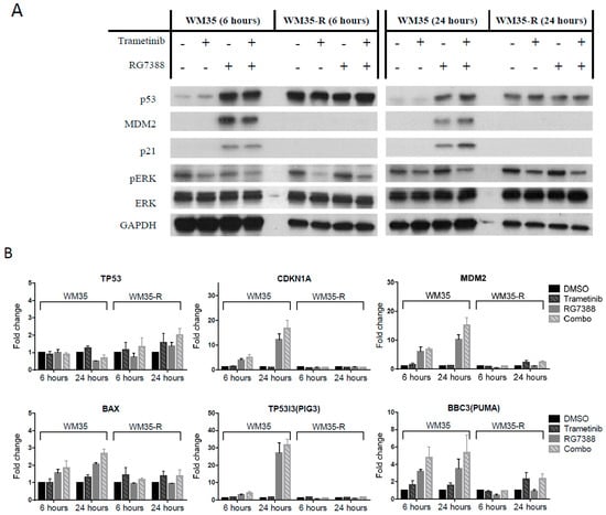 The combination effects were also explored in WM35-R [9], a p53 mutated (p53MUT, Gly334Val) cell line, selected from WM35 (Figure 3). Although the WM35-R cells remained responsive to trametinib (1 nM), there were no significant differences with and without the addition of RG7388 (0.2 µM) on protein responses (Figure 3A), transcripts (Figure 3B), or cell cycle distribution (Figure 3C,D), and only the effects of trametinib could be found in WM35-R treated with combination of trametinib and RG7388, indicating RG7388 played no role in the response of WM35-R, suggesting that the effects of combination seen in the p53WT WM35 and A375 are p53 dependent.