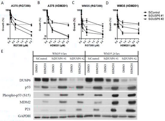 The following are available online at http://www.mdpi.com/2072-6694/11/1/3/s1, Figure S1: DUSP6 mRNA expression in different cancer types, Figure S2: Clonogenic survival of A375 treated with trametinib, RG7388 and HDM201 for 72 h, Figure S3: Immunoblotting of A375 and WM35 treated with trametinib or vemurafenib, Figure S4: Immunoblotting of A375 cells treated with trametinib, HDM201, or combinations of the two compounds for 6 and 24 h, Figure S5: Immunoblotting of A375 after DUSP6 siRNA knockdown, followed by 200 nM RG7388 ± 10 µM KU55933, Figure S6: Cell cycle distribution (A–D) and Sub-G1 phase (E) of A375 cells after treatment with two siRNA against DUSP6 for 24 h, followed by HDM201 addition for 24 and 48 h, Figure S7: Cell cycle distribution (A–D) and Sub-G1 phase (E,F) of WM35 cells after treatment with two siRNA against DUSP6 for 24 h, followed by HDM201 addition for 24 and 48 h, Figure S8: Growth inhibition of A375 and WM35 cells treated with the BCI DUSP6 inhibitor.