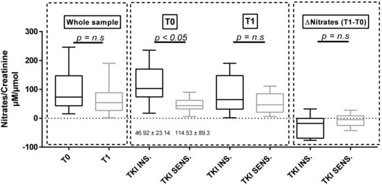 Nitrate/creatinine ratio at baseline and at T1 in the whole sample and in the two subgroups defined according to the sensitivity of BP to TKI therapy. TKI SENS = TKI-sensitive patients; TKI INS = TKI-insensitive patients, BP: blood pressure, n.s: no significant.