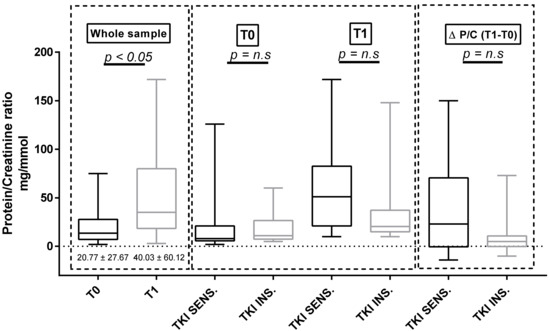 Protein/creatinine ratio at baseline and at T1 in the whole sample and in the two subgroups defined according to the sensitivity of BP to TKI therapy. n.s: no significant.