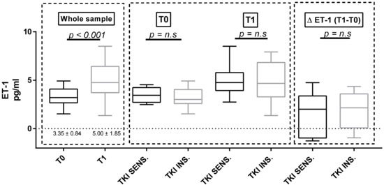 Endothelin-1 (ET-1) at baseline and at T1 in the whole sample and in the two subgroups defined according to the sensitivity of BP to TKI therapy n.s: no significant.