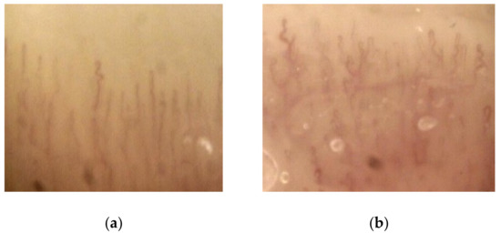 Regarding the effects on microcirculatory patterns induced by anti-VEGF TKI, an increasing number of participants developed a clinical and demonstrable change in microvessels at periungual capillaroscopy, especially in terms of tortuosity, reduction in vascular diameter, and architectural disorder, but without a clear decrease in capillary density. In fact, capillary rarefaction has been demonstrated in the oral mucosa of sunitinib and telatinib-treated patients [11,30]; its putative relationship with the development of hypertension may also due to a possible contribution of small vessels in determining systemic vascular resistance. Furthermore, we did not see a statistically significant diversity in term of capillaroscopic findings in the two subgroups that were defined according the presence of BP increases after one month of therapy. For proteinuria, we cannot exclude a role of vascular remodeling in hypertensive patients with a long history of anti-VEGF assumption; however, our data do not support a major role in the immediate rise of BP after TKI initiation.