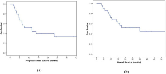 Antiangiogenic therapy was shown to be significantly effective in shrinking peripheral metastasis in more than half of the participants (Figure 5) or stop disease progression in the remaining ones. Among patients treated as first-line therapy, 56% were progression-free at 12 months (median progression-free survival (PFS) 10.8 months, Figure 6a). For patients treated with the second or third-line therapies, the progression-free survival (PFS) rate at six months was 50%. The overall survival (OS) rate of patients treated with first-line therapies at 24 months was approximately 60% (median OS 28.8 months, Figure 6b), while in patients treated with second or third-line therapies, the OS rate at 12 months was 40%. These data are in line with those reported in the literature [15,16]. We did not find a clear correlation between either PFS or OS with TKI sensitivity.