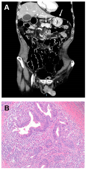 - Sigel, J.E.; Petras, R.E.; Lashner, B.A.; Fazio, V.W.; Goldblum, J.R. Intestinal adenocarcinoma in Crohn’s disease: A report of 30 cases with a focus on coexisting dysplasia. Am. J. Surg. Pathol. 1999, 23, 651–655. [Google Scholar] [CrossRef]