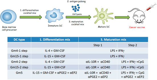 DCs were generated from murine bone marrow cells, as described by Garrigan K. et al. [58] with minor modifications. Briefly, bone marrow was flushed from the long bones of ID8 tumor bearing mice. A single cell suspension was cultured in RPMI 1640 (CellGro, New York, NY, USA) supplemented with 10% heat-inactivated FBS (Life Technologies, USA), 2 mM L-glutamine (Gibco, USA), 100 U/mL penicillin (Gibco, USA), 100 µg/mL streptomycin (Gibco, USA), 10 mM HEPES pH 7.4 (Gibco, USA), 0.5 mM sodium pyruvate (Cellgro, USA), 0.5% MEM non-essential amino acids (Cellgro, USA), 0.1 mg/mL Normocin (InVivogen, San Diego, CA, USA). Cells were then differentiated according to (Figure 1) and as follows: For GM4 DCs -1 step or -2 step: with 20 ng/mL recombinant murine GM-CSF and 10 ng/mL IL-4 for 4 days (on day 2, the medium was replaced with fresh medium containing same cytokines); for GM15 1-step/2-step and DC5s: with 20 ng/mL GM-CSF and 10 ng/mL IL-15 for 4 days (on day 2, the medium was replaced with fresh medium containing same cytokines). For DC5 DCs: on day 1 with 20 ng/mL GM-CSF and 10 ng/mL IL-15; on day 2, the medium was replaced with fresh medium containing: GM-CSF (20 ng/mL), IL-15 (10 ng/mL) and both anti-PGE2 (0.1 µg/mL) and anti-EP2 Ab (0.2 µg/mL). On day 4, DCs were kept unpulsed or pulsed with squaric acid treated tumor lysate (LSQ) using ~1 tumor cell equivalent per DC and incubated for 12–16 h. After pulsing, DCs were matured as follows: for GM4-1 step and GM15-1 step: on day 5 the medium was removed and fresh medium containing 100 ng/mL LPS and 100 ng/mL IFNγ was added and incubated for 24 h at 37 °C and 5% CO2. For GM4-2 step and GM15-2 step: on day 4 fresh medium containing anti-CD40 Ab FGK45 (0.2 µg/mL) + anti-IL-10R blocking Ab (0.5 µg/mL) was added; on day 5, the medium was removed and fresh medium containing LPS (20 ng/mL), IFNγ (100 ng/mL) and CpG-ODN 1585 (10 μg/mL) was added and kept for 24 h. For DC5 DCs: on day 4, fresh medium containing anti CD40 Ab FGK45 (0.2 µg/mL) + anti-IL-10R blocking Ab (0.5 µg/mL) + anti-EP2 Ab (0.1 µg/mL) + anti-PGE2 (0.1 µg/mL) was added. After 3 h, the medium was removed and fresh medium containing anti-PGE2 (0.1 µg/mL), anti-EP2 Ab (0.2 µg/mL), LPS (20 ng/mL), IFNγ (100 ng/mL) and CpG-ODN 1585 (10 μg/mL) was added and incubated overnight. Cells were then harvested, stained with indicated antibodies followed by FACS analysis (Canto-II, BD bioscience, San Jose, CA, USA) or used for animal vaccination.