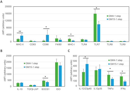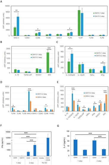 In addition to this, we then further compared the same 2-step maturation protocol in DCs differentiated in the presence of IL-4/GM-CSF (GM4-2 step DCs), or IL-15/GM-CSF. Our results showed that the latter (GM15-2 step DCs) exhibited higher MHC-II, CD86, TLR4, IL-12/23p40, IL-12p35 and IFNγ, and lower IDO and suppressor of cytokine signaling 1 (SOCS1) relative to GM4-2 step DCs, suggesting a potentially more immunogenic phenotype (Figure 3D,E).