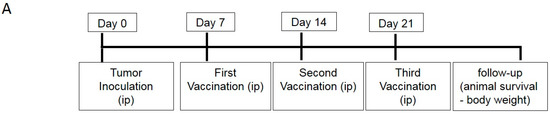 1 × 106 DCs (resuspended in 500 µL DPBS) were injected i.p. on day 7, 14 and 21 following intraperitoneal inoculation of 1 × 106 ID8 cells (in 500 µL DPBS) at day 0. Animals were monitored regularly for tumor growth by measuring the body weight. Mice attaining 30 g body weight were sacrificed (~40% increase in body weight over age/sex-matched normal mice).