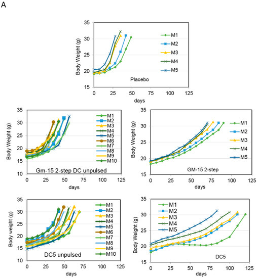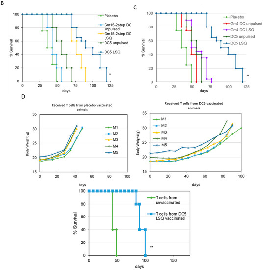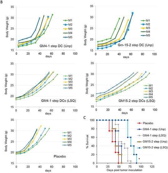 DCs matured with a two-step protocol in the presence of anti-CD40 and anti-IL10R antibodies for 24 h, followed by LPS/IFNγ/CpG stimuli prolong animal survival in a vaccination mouse model of ovarian cancer. (A) Vaccination scheme: mice were inoculated i.p. with ID8 cells at day 0, followed by i.p. vaccination with the indicated DC formulations (pulsed with an ID8 tumor cell lysate treated with squaric acid (LSQ) or kept unpulsed (Unp)) at day 7, 14 and 21 (n ≥ 5 for each group). (B,C) Body weight and animal survival were evaluated and plotted in Kaplan–Meier cumulative survival plots. Student’s t test results (comparing GM15-2 step DCs (LSQ) to both GM4-1 step DCs (LSQ) and placebo) is indicated with an asterisk: * p < 0.05. (CpG: CpG oligonucleotides; DC: dendritic cells; IFN-γ: interferon-γ; LPS: lipopolysaccharide).