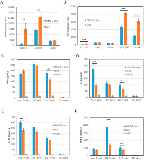 We then tested the in vitro induced T-cell responses by co-culturing GM15-2 step DCs or DC5 (prepared from bone marrow cells of tumor bearing animals) with T cells derived from ascites, spleen or draining lymph nodes of tumor bearing animals for 24 h and subsequently measuring levels of IFNγ, IL-4, TGFβ and IL-10 in the culture supernatant by ELISA. Results showed that while levels of IFNγ were essentially comparable between the two different DC preparations in use (when comparing between same T cells types, Figure 5C; except in the case of splenic T cells), IL-4 and IL-10 levels were significantly lower in co-cultures of ascites T cells with LSQ antigen-pulsed DC5 DCs compared to the respective GM15-2 step DC counterpart (Figure 5D,E). DC5 DCs also induced significantly less IL-4 when co-cultured with splenic T cells compared to GM15-2 step DCs (Figure 5D). Finally, LSQ antigen-pulsed DC5 elicited significantly lower amounts of TGFβ in co-cultures of lymph node and splenic T cells compared to GM15-2 step DCs (Figure 5F). Thus, the in vitro results here presented, taken collectively, suggest that DC5 display a more advantageous DC phenotype than the previously characterized GM15-2 step DCs, they induce a more favorable cytokine profile in co-cultured T cells and they can be therefore considered more immunogenic.