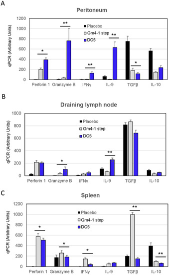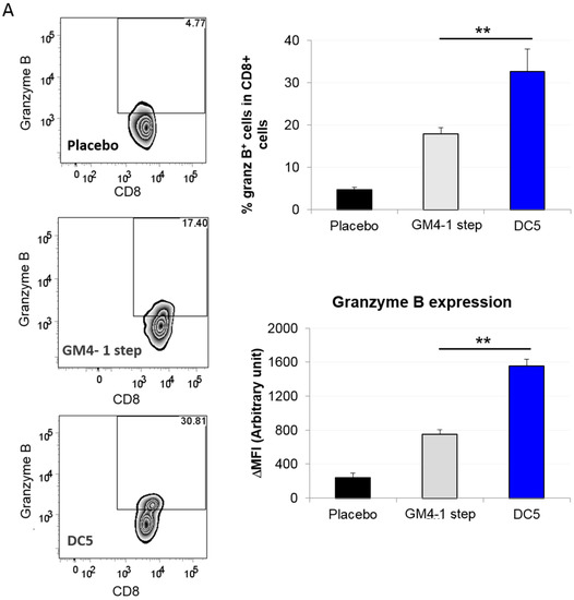 Finally, we cultured T cells isolated from vaccinated animals with autologous DCs pulsed with LSQ (or unpulsed DCs in case of placebo), in the presence of IL-12 for 24 h and analyzed cytokine levels by qPCR. T cells isolated from the peritoneum of animals vaccinated with DC5 were superior in terms of perforin, granzyme B, IFNγ and IL-9 mRNA levels compared to both the respective placebo and classical GM4-1 step DC counterparts (Figure 8A). In the instance of T cells isolated from draining lymph nodes, DC5 vaccination induced higher granzyme B and IL-9 mRNA levels compared to GM4-1 step vaccination; while perforin and IFNγ levels were comparable between the two conditions (Figure 8B). On the other hand, T cells isolated from the spleen of DC5 vaccinated animals showed lower granzyme B, IFN-γ, TGF-β and IL-10 mRNA levels, compared to GM4-1 step vaccinated animals (Figure 8C).