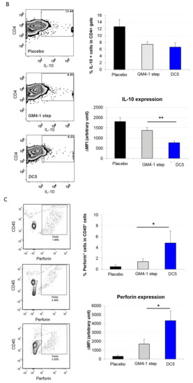 Based on the fact that vaccination with the DC5 formulation conferred the highest survival advantage in the present study, we decided to further characterize its induced T cell response and compare it with the one elicited by classical GM4-1 step DC vaccination which is the current golden standard for DC vaccines in clinical settings. To achieve this, we first established metastatic tumors by injecting i.p. ID8 cells (day 0) in 8–10 week old female C57BL6 mice, followed by i.p. vaccination with DCs (or placebo) on days 7, 14 and 21 post tumor inoculation. Then, at 42 days post tumor inoculation, we isolated cells from the peritoneal cavity and performed a flow cytometric analysis for different markers of cell cytotoxicity. Interestingly, we observed that in the CD8+ cell compartment both the expression (in terms of ΔMFI) and the percentage of granzyme B+ T cells were significantly higher in DC5 vaccinated animals compared to animals vaccinated with GM4-1 step DCs or placebo (Figure 7A). A similar analysis was also repeated for CD8+ T cells isolated by negative selection from draining lymph nodes and spleen, showing that DC5 vaccination induced significantly higher levels of granzyme B+ T cells also in these animal loci compared to the other two conditions (authors personal observation). Additionally, in the peritoneum cell compartment we also observed that, although the percentage of CD4+ T cells expressing IL-10 was comparable between animals vaccinated with GM4-1 step DCs and DC5, the amount expressed (in terms of ΔMFI) in the latter case was significantly lower (Figure 7B). Interestingly, CD45+ peritoneal cells form DC5 vaccinated animals also presented higher expression (in terms of ΔMFI) and percentage of perforin+ cells compared to control counterparts (Figure 7C).