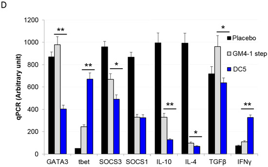 Given that we used an intra-peritoneal model of ovarian cancer, we also performed a qPCR analysis of the whole CD45+ population from peritoneum of vaccinated animals to get a better understanding of the tumor microenvironment. Analyses showed that DC5 vaccinated animals were characterized by significantly lower GATA3, SOCS3, IL-10, IL-4, TGF-β mRNA and higher tbet and IFNγ levels compared to GM4-1 step vaccinated animals; all indicative of a Th1-skewed T cell response (Figure 7D).