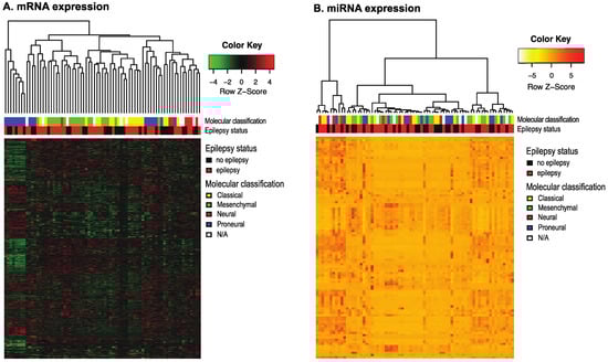Lack of correlation between GBM-associated epilepsy and gene expression data. (A) Heatmap showing gene expression patterns of the 1000 RNA microarray probes with the highest standard deviation. Relative downregulation is shown as green, relative upregulation is shown as red, see color key. No differentially expressed genes were observed after correction for multiple testing (BH adjusted p < 0.05). (B) MiRNA expression patterns of the 100 probes with the highest standard deviation. 67 samples from our institute were included in this analysis. Relative miRNA downregulation is shown as white/yellow, and relative miRNA upregulation is shown as red, see color key. No differentially expressed miRNAs were observed after correction for multiple testing (Benjamini Hochberg adjusted p < 0.05).