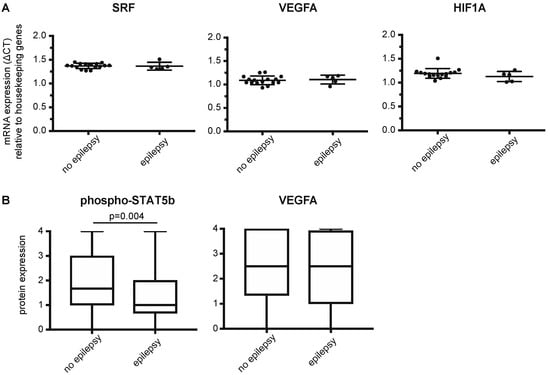 qPCR experiments in a subset of fresh-frozen GBM samples (epilepsy n = 5, no epilepsy n = 16) did not show significant differential expression of HIF1a, VEGF or SRF (Figure 2A). However, on a protein level, we observed a significant decrease in protein expression of nuclear phosphorylated STAT5b in the epilepsy subgroup (Mann-Whitney U test, p = 0.004, Figure 2B). The JAK/STAT5b pathway has been shown to closely correlate with hypoxia and HIF-1α signaling in multiple cancers [,,,]. VEGFA and SRF protein expression did not differ between the two groups (Figure 2B and Figure S1).