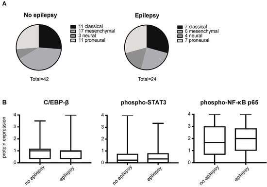 In the subgroup of patients without epilepsy a relatively larger percentage of tumors was classified as the mesenchymal subtype compared to the epilepsy group (40% vs. 25%), but this difference did not reach statistical significance (Chi-square test, p = 0.48, Figure 3A). In line with these results, no significant difference was observed in protein expression of phosphorylated NF-κB p65, phosphorylated STAT3 and CEBP-β (Figure 3B), which are master transcriptional regulators of the mesenchymal gene signature in GBM.