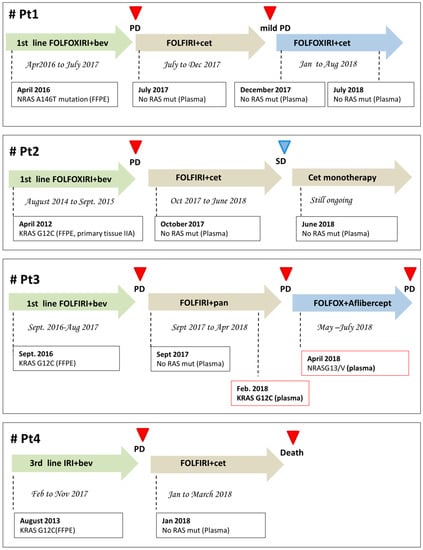 Eleven mCRC patients (pts) with primary diagnosis of RAS mutant mCRC were prospectively enrolled for ctDNA analysis at the time of disease progression at failure of anti-VEGF based treatments (first line 5 pts; second line 3 pts; third line 3 pts). RAS mutational status, as assessed in plasma samples by Idylla™ system [], was found mutant in 6 pts (55%), retaining the same plasma mutation as in the primary tumor at diagnosis, and wild-type in 5/11 (45%) (Table 1). Plasma DNA samples for further IT-PGM sequencing were available from 4/5 patients testing negative for RAS mutational status at Idylla™ determination. Neither RAS mutations originally identified in the primary tumor nor de novo RAS mutations were detected in these samples, even searching for very low frequencies alleles (Table 2). The four patients testing negative for RAS mutations in plasma at both Idylla™ system and It-PGM sequencing were considered eligible for treatment with EGFR inhibitors. They were all treated with anti-EGFR based therapies, with concomitant longitudinal monitoring of plasma ctDNA RAS mutational analysis every 2–3 months. Patient 1 had a primary diagnosis of RAS mutant metastatic rectal cancer (NRAS A146T) and his clinical history has been partially published []. After failure of first line FOLFOXIRI/BEV therapy, he received a second line with FOLFIRI/CET, according to the absence of any detectable RAS mutation as assessed by plasma ctDNA analysis. The treatment was well tolerated and the patient achieved a partial response which lasted 6.5 months. At December 2017, a mild progression of disease was diagnosed, with pericardial effusion. A second ctDNA analysis was performed on both plasma and pericardial fluid and confirmed in both specimens the absence of any detectable RAS mutations. Given that the patient still had a good performance status and was willing to undergo further therapy, the reintroduction of oxaliplatin, in combination to FOLFIRI/CET, was decided. The patient had a stable disease and symptoms control until last clinical evaluation (August 2018). A third ctDNA analysis (May 2018) confirmed the absence of any detectable RAS mutations. The duration of response to cetuximab-based treatment (second line) is currently of 12 months (Figure 1). Patient 2 had a primary diagnosis of stage III RAS mutant colon cancer (KRAS G12C), with evidence of liver metastasis six months after the diagnosis. She was enrolled at failure of a first line therapy with FOLFOXIRI/BEV. Based on the absence of any detectable RAS mutations in plasma ctDNA, from October to December 2017, she received a second line with FOLFIRI/CET. In January 2018, a CT scan showed stable disease and, according to the confirmed absence of any detectable RAS mutations in plasma, a maintenance therapy with DE GRAMONT/CET was started. Last CT scan (June 2018) still confirmed the stability of disease. Given the absence of any RAS mutations in plasma and considering patient’s preferences, a monotherapy with Cetuximab 500 mg/mq g1 q15 was started. The duration of response to cetuximab-based treatment (second line) is currently of 10 months (Figure 1). Of note, a histopathological revision of the primary tumor tissue was performed in this patient at June 2018, unexpectedly revealing RAS wt status. Patient 3 had a primary diagnosis of mutant RAS mCRC (KRAS G12C). He was enrolled at failure of first line (FOLFIRI-BEV) in August 2017. Based on the absence of any detectable RAS mutations in plasma ctDNA, from September 2017 to April 2018, he received a second line with FOLFIRI/PANITUMUMAB. In February 2018, the plasma analysis was repeated revealing the re-appearance of a G12C mutation. The treatment was continued until clinical evidence of PD (April 2018). At that time, the plasma analysis revealed the appearance of a new NRASG13/V mutation. This patient is currently receiving FOLFOX/BEV. The duration of response to panitumumab-based treatment was six months (Figure 1). Patient 4 had a primary diagnosis of mutant RAS (KRAS G12C) metastatic rectal cancer. She was enrolled at failure of a third line treatment (IRINOTECAN/BEV). Based on the absence of any detectable mutations in plasma ctDNA, from January to March 2018, she received a fourth line with IRINOTECAN/CET. After two months of therapy, serum levels of CEA and CA 19.9 significantly decreased. In April 2018, the patient experienced cognitive symptoms and a CT scan showed brain PD. ctDNA analysis was not repeated due to the clinical deterioration of the patient, who died in May 2018. The duration of response to cetuximab-based treatment in this patient was four months (Figure 1).