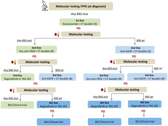 Proposed therapeutic algorithm for RAS-mutated mCRC based on serial molecular testing of RAS genes mutations in plasma. When RAS mutations are found at diagnosis in primary/metastatic tumor tissue, this algorithm suggests re-testing the mutational status of RAS genes in plasma at each progression of disease. In this scenario, the therapeutic choice is longitudinally re-adjusted depending on whether liquid biopsy reveals the negative selection of RAS-mutant clones at progression after any lines of therapy. This allows incorporating an additional treatment option (anti-EGFR plus chemotherapy) in the “continuum of care” aimed at improving survival and quality of life of patients with RAS-mutated mCRC. Standard treatment options for patients who maintain RAS mutations in blood are indicated in green. Therapeutic options for patients who convert to RAS-wild type at any point are indicated in blue (additional line of therapy as compared to standard is highlighted in dark blue). BSC, best supportive care; CT, chemotherapy; FFPE, formalin-fixed paraffin-embedded; mCRC, metastatic colorectal cancer; PD, progression of disease.