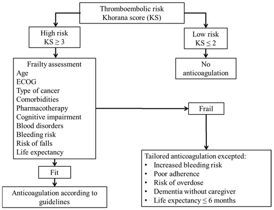A decision-making algorithm has been developed for the use of anticoagulants in patients with AF [67]. Given the similarities regarding age and frailty in AF and cancer patients we found appropriate to adapt the AF algorithm to patients with cancer taking into account specific frailty contributing factors in relation with malignancy (Figure 1).