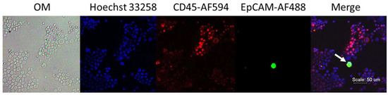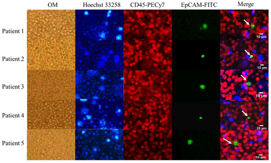Detection of circulating tumor cells (CTCs) in peripheral vein blood (PB) from colorectal cancer (CRC) patients. The images were acquired on the microscope at 10× magnification. OM: bright-field images under optical microscopy. The target cells are marked with white arrows. Blue: Hoechst 33258; Red: CD45-PECy-7; Green: EpCAM-FITC.
