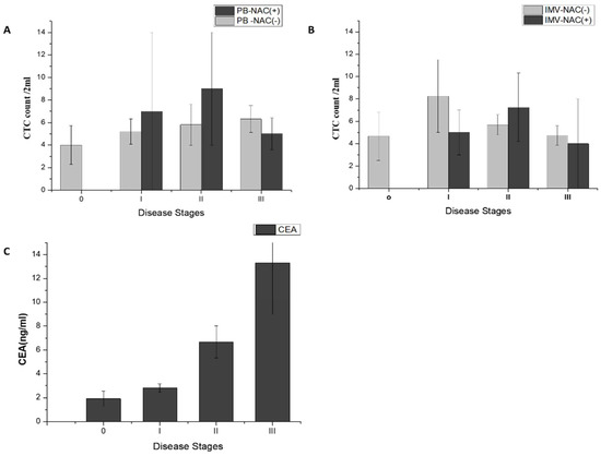 In addition, we found that the mean of CTC count in the PB NAC(−) group increased with disease stage (stage 0 to stage III; mean ± standard error of the mean (SEM) 4.0 ±1.7 to 6.3 ± 1.8, Figure 3A), while the same trend was not observed in the IMV NAC(−) group (Figure 3B). For PB NAC(+) and IMV NAC(+) groups, CTC count did not correlate with disease stages. We also noticed that serum CEA level had a stronger association to disease stages compared to that found for the CTC count (Figure 3C).