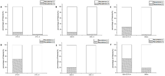 The recurrence rates in patients stratified by their CTC and carcinoembryonic antigen (CEA) counts, and their combination. (A) Recurrence rates of different CTC levels in non-metastatic patients; (B) recurrence rates of different CEA levels in non-metastatic patients; (C) recurrence rates of different CTC and CEA levels in non-metastatic patients; (D) recurrence rates of different CTC levels in metastatic patients; (E) recurrence rates of different CEA levels in metastatic patients; (F) recurrence rates of different CTC and CEA levels in metastatic patients.