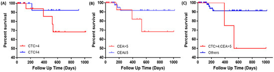 Kaplan–Meier survival curves of progression-free survival in patients with non-metastatic diseases, stratified with CTC and CEA. (A) Red line: CTC > 4; blue line: CTC ≤ 4; p = 0.242; (B) red line: CEA > 5 ng/mL; blue line: CEA ≤ 5 ng/mL, p = 0.176; (C) red line: both CTC > 4 and CEA > 5 ng/mL; blue line: others, p = 0.033.