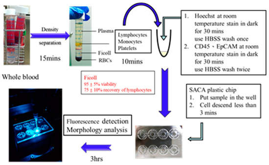 Figure 6 shows the experiment process flow of all clinical samples. It took about 25 min to separate the PBMC from the blood, and about 60 min to dye the cell. The SACA chip system was used in CTC enumeration, and the cells were self-assembled on the SACA chip for 5 min. Finally, the images were observed using a fluorescence microscope for about 3 h. The entire sample processing took about 4.5 h.