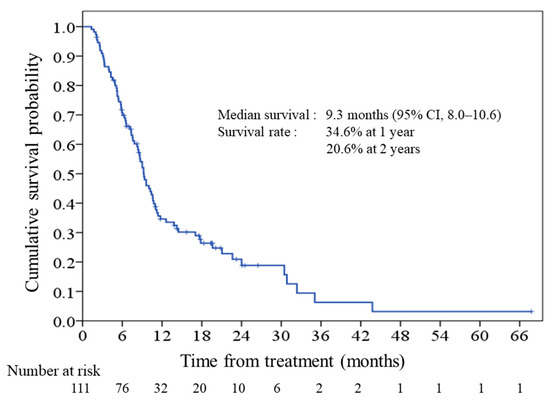 - Kurihara, T.; Kogo, M.; Ishii, M.; Yoneyama, K.; Kitamura, K.; Shimada, K.; Shimizu, S.; Yoshida, H.; Kiuchi, Y. Practical prognostic index for survival in patients with unresectable pancreatic cancer treated with gemcitabine or S-1. Hepatogastroenterology 2015, 62, 478–484. [Google Scholar] [PubMed]